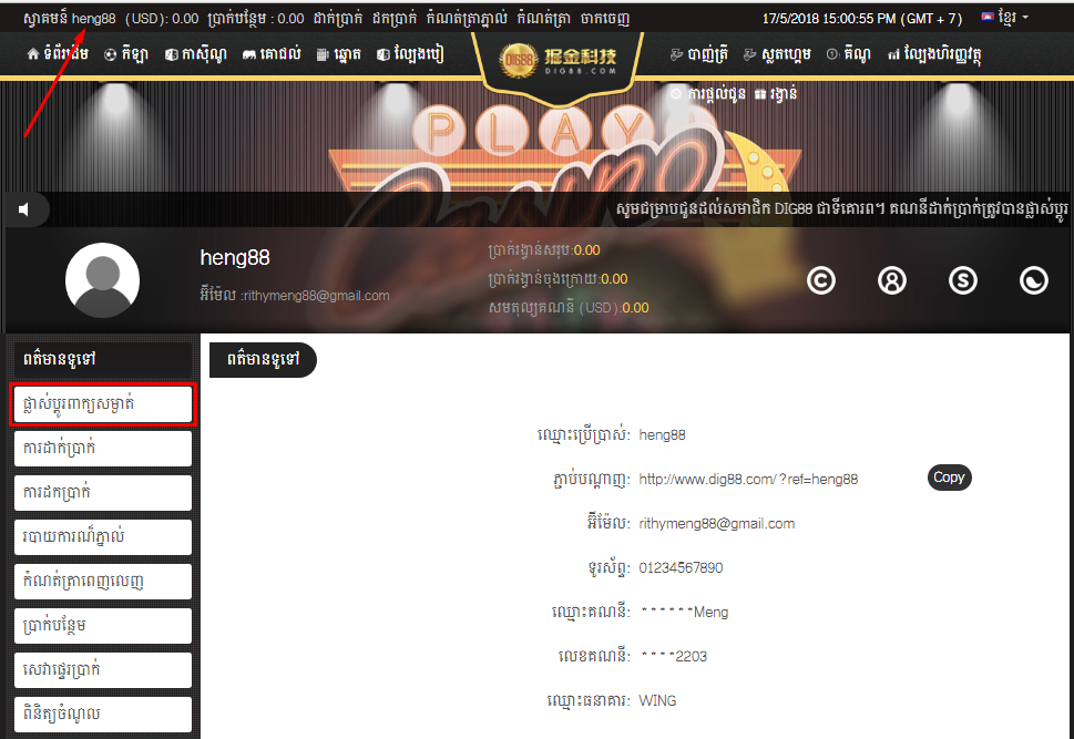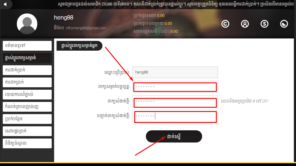 សម្រាប់ផ្លាស់ប្តូរលេខសម្ងាត់ គឺជារឿងងាយស្រួលទេ គ្រាន់តែអ្នកចូលនៅក្នុងគណនីរបស់ខ្លួន រួចចុចលើឈ្មោះគណនីរបស់អ្នក រួចហើយនឹងចេញផ្ទាល់សរសេរជាអក្សរខ្មែរថា “ផ្លាស់ប្តូរពាក្យសម្ងាត់” ឬអនុវត្ដិន៍ដូចខាងក្រោមនេះ៖