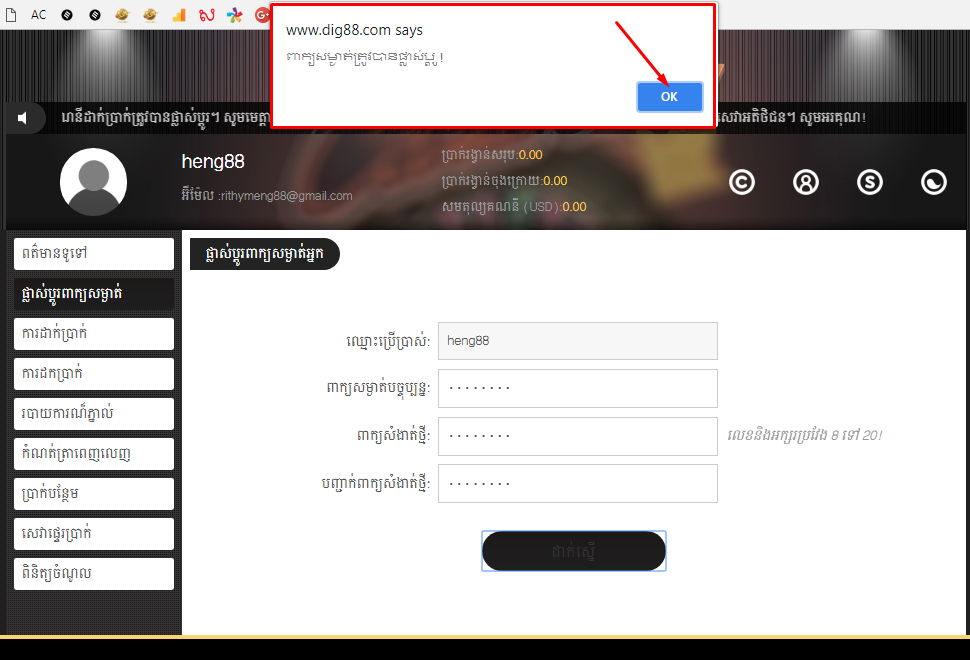 បន្ទាប់មក គេនឹងបញ្ជាក់ថា លេខសម្ងាត់របស់អ្នកត្រូវបានផ្លាស់ប្តូរជោគជ័យ។ សូមចុចពាក្យថា “OK” គឺជាការស្រេច។